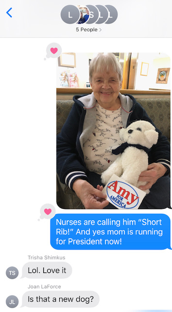She got right up to give me a hug, and I presented the gifts to her one at a time, a cup of coffee, a chocolate chip cookie, an Amy for America sticker, and a new stuffed dog. She put the new dog on her lap immediately. They were instant friends.